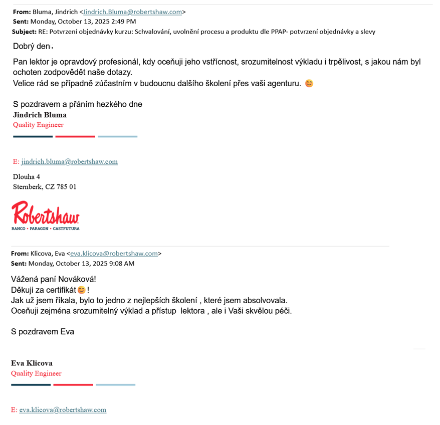 13.10.2025 -> Děkuji za novou recenzi na školení PPAP, otevřený kurz pořádaný spřátelenou organizací. (E.K. + J.B., Robertshaw), 9.10.2025: "Bylo to JEDNO Z NEJLEPŠÍCH ŠKOLENÍ, které jsem absolvovala. Pan lektor je opravdový PROFESIONÁL, kdy oceňuji jeho vstřícnost, srozumitelnost výkladu i TRPĚLIVOST, s jakou nám byl ochoten zodpovědět naše dotazy.